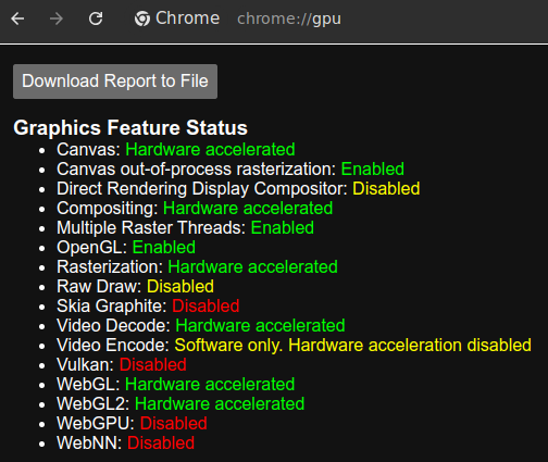 * WebNN: DisabledMaybe this has to do with Vulkan being disabled? As you can see though, HWDEC is enabled...