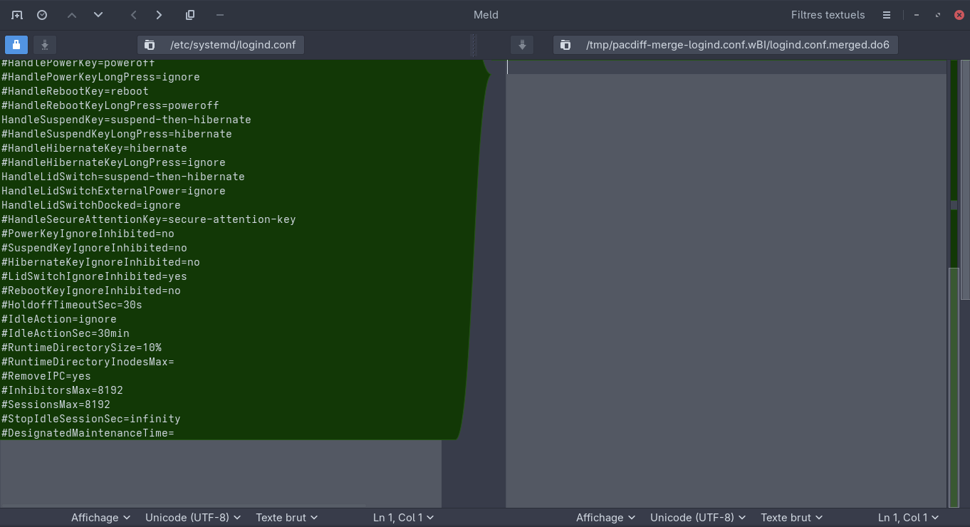 pacdiff then writes in the console "Merged without conflicts", and proceeds to open a 2-way diff between the installed (not updated) config file... and an empty file (screenshot).
