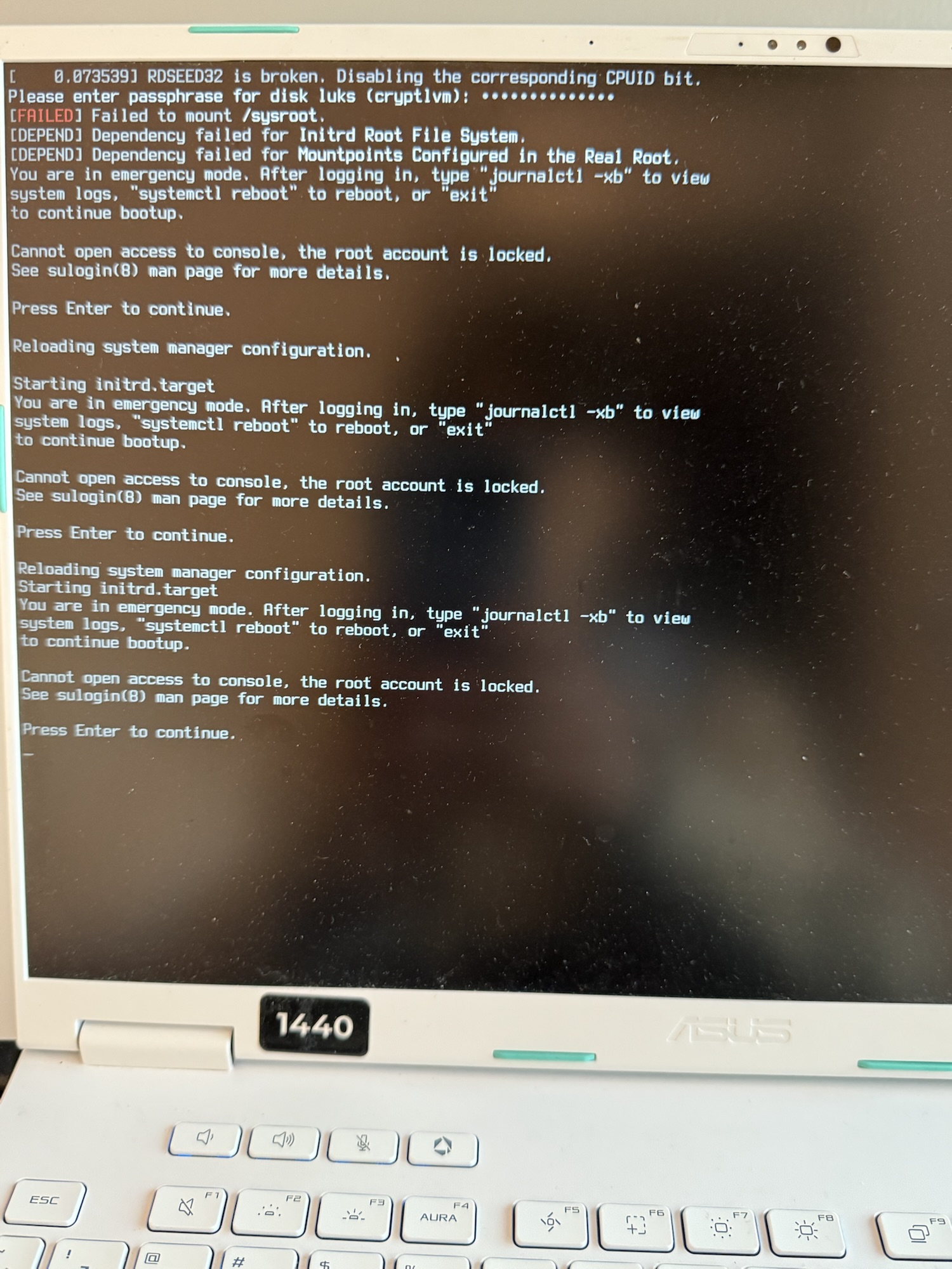 I think luks is decrypted successfully, but maybe lvm or the file system doesn’t work so I can’t go into the kernel.