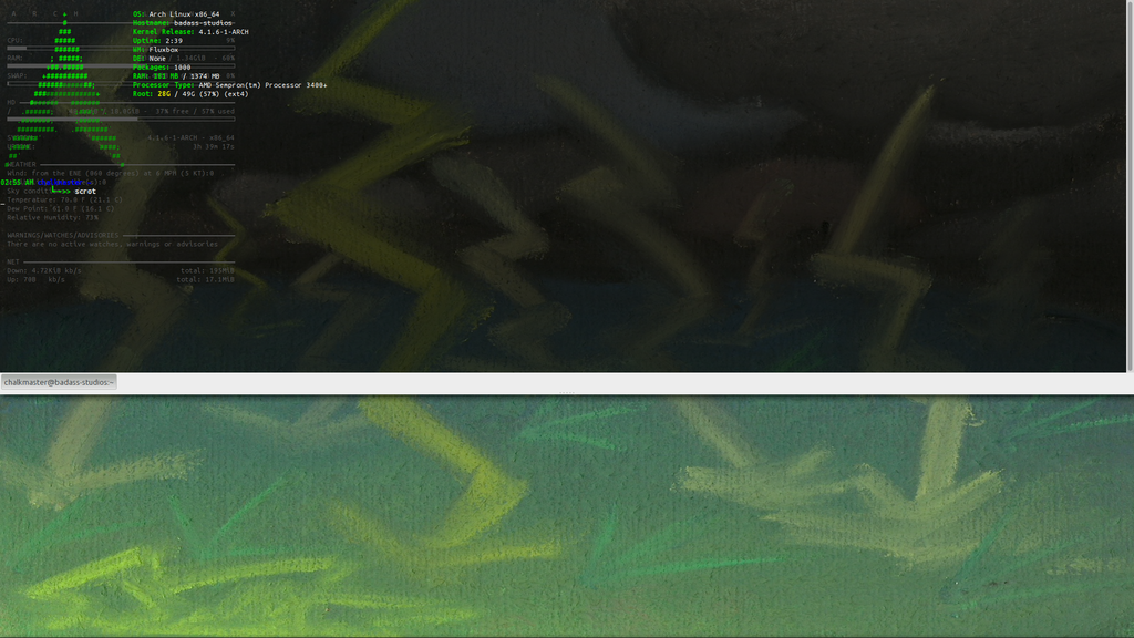 Ditched E + Terminology for Fluxbox + Compton + SpaceFM + Conky + Guake a few days ago. Theme is trans_waita WM style + Adwaita GTK + Elementary icons and cursors. .conkyrc is an adaptation of the one I used back when I was on Archbang. Wallpaper is a chalk lightningstorm scene I drew a few months ago on cardboard gathered from an empty crackerbox.